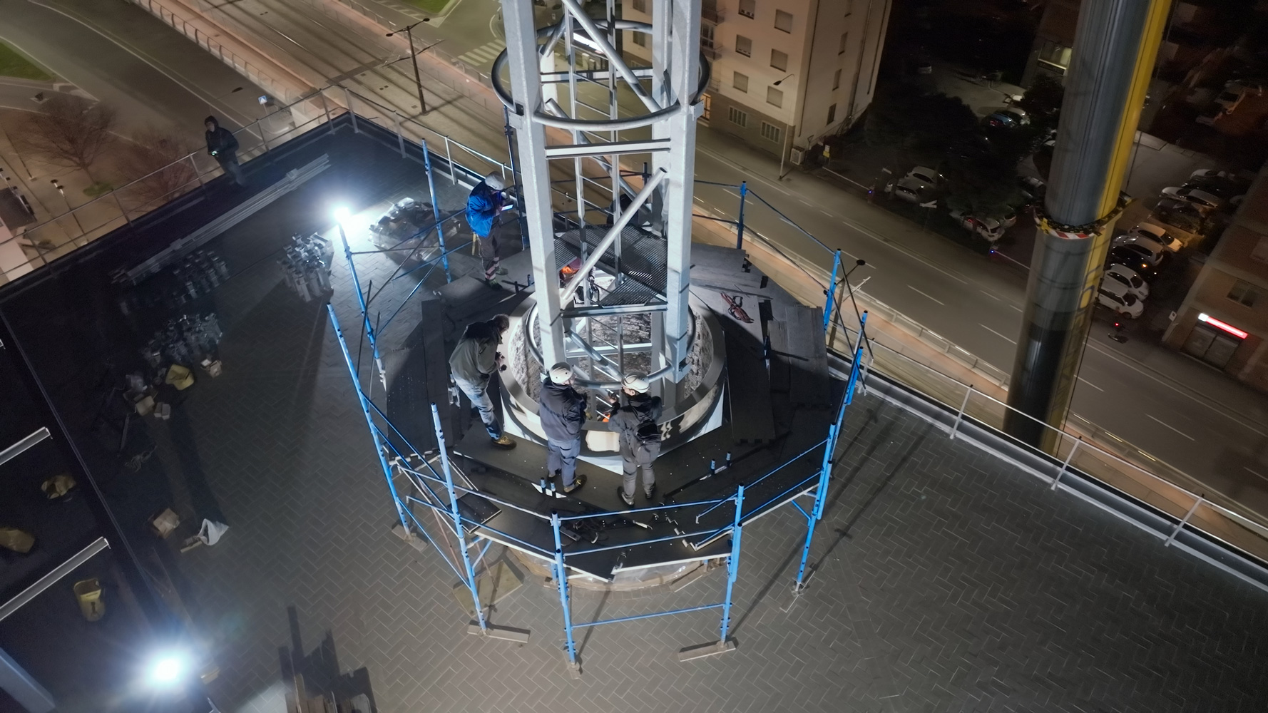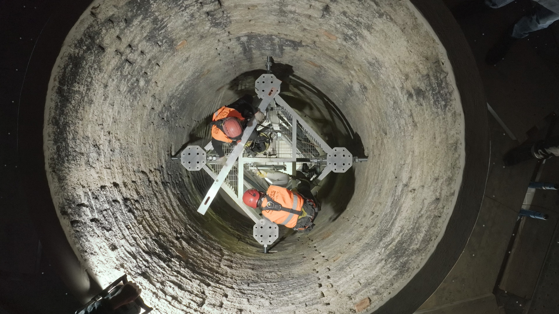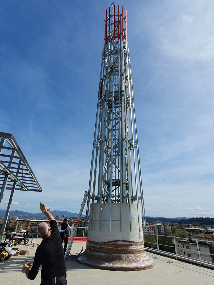 Ritenuto adeguato il basamento esistente della ciminiera, su esso (all’interno della porzione sopravvissuta) è stata appoggiata la nuova struttura (tralicciata a sezione quadrata sufficientemente piccola da poter attraversare la ‘bocca’ superiore della porzione sopravvissuta) per farla poi emergere fino al raggiungimento della quota massima.