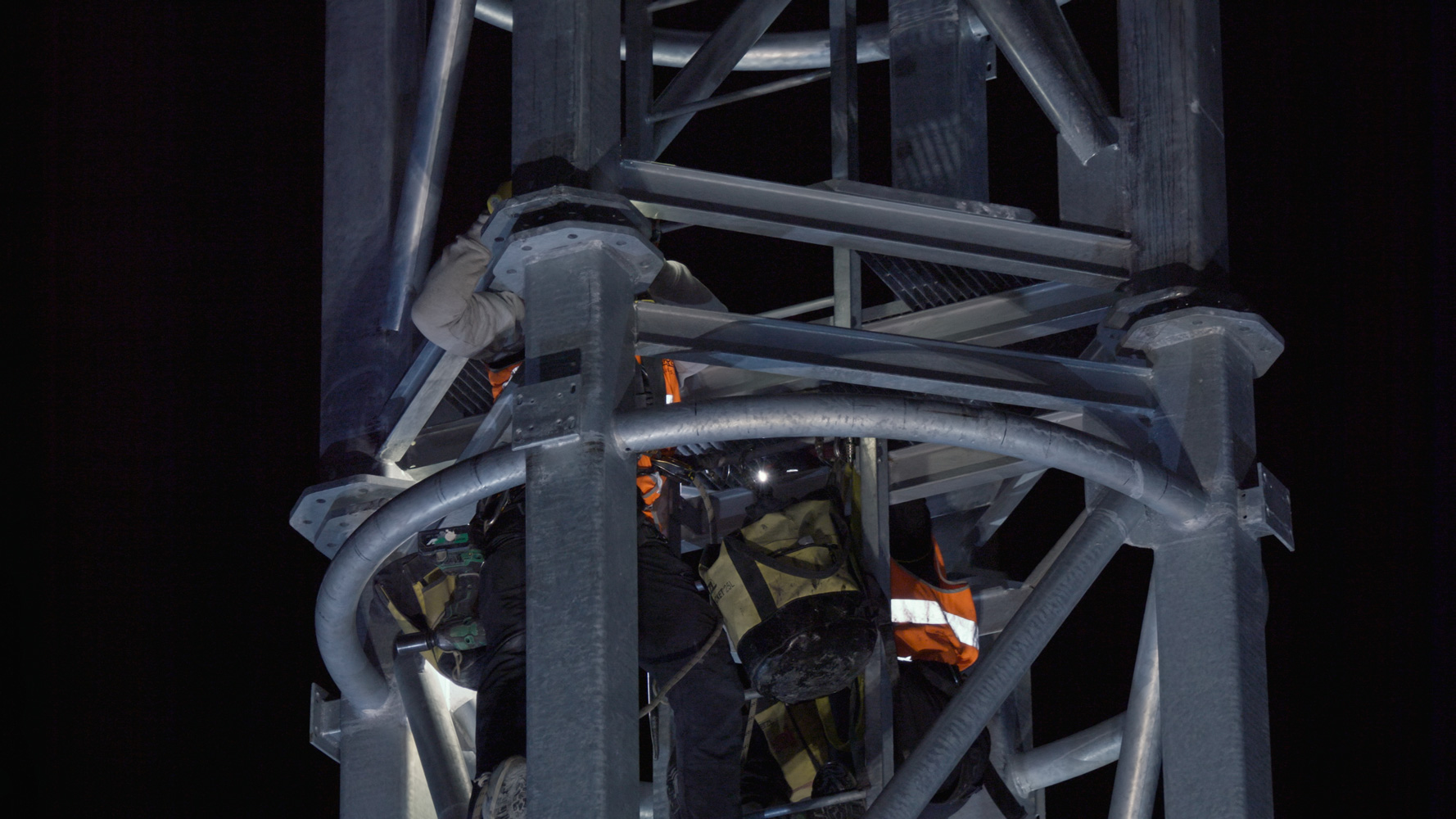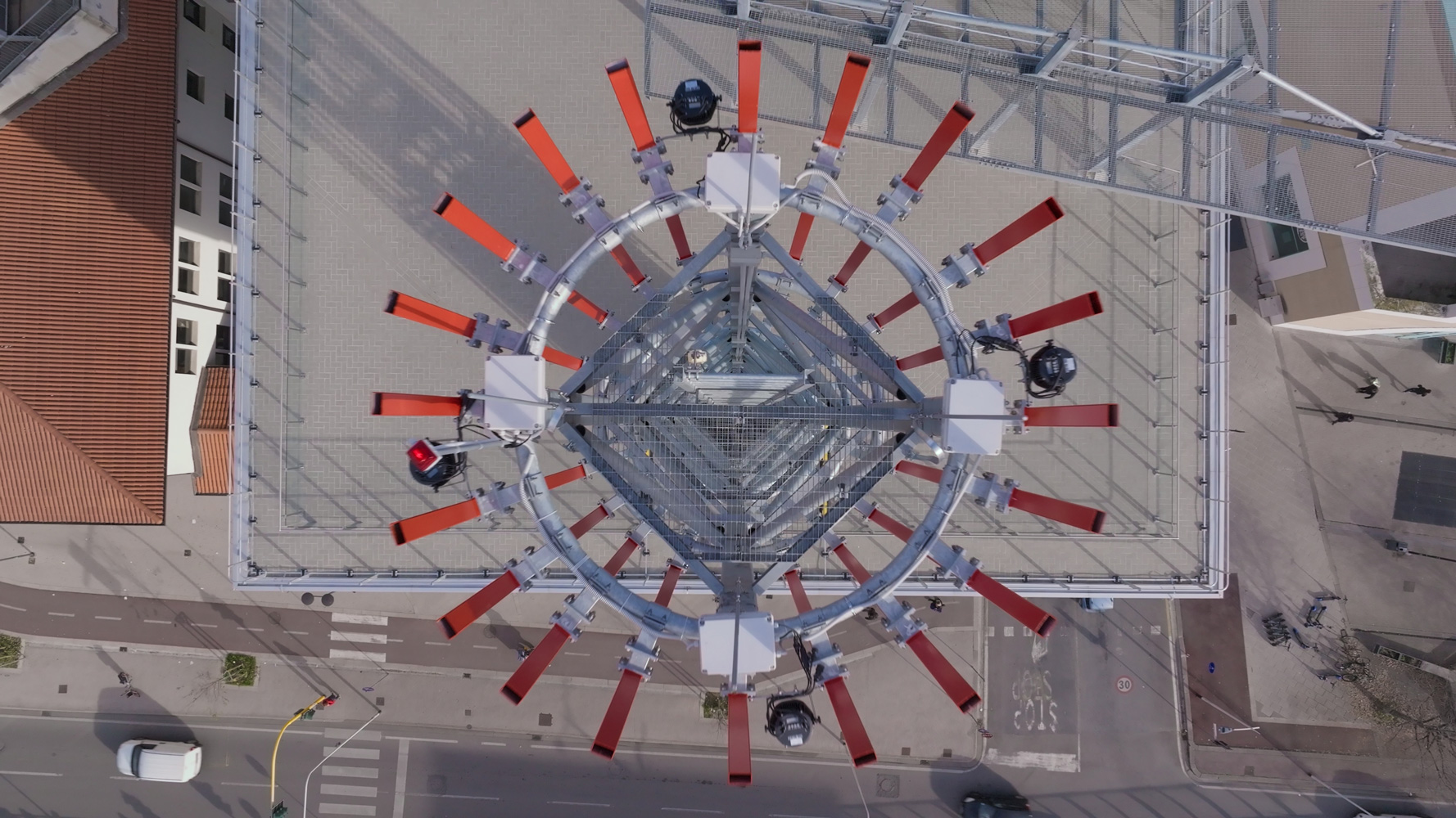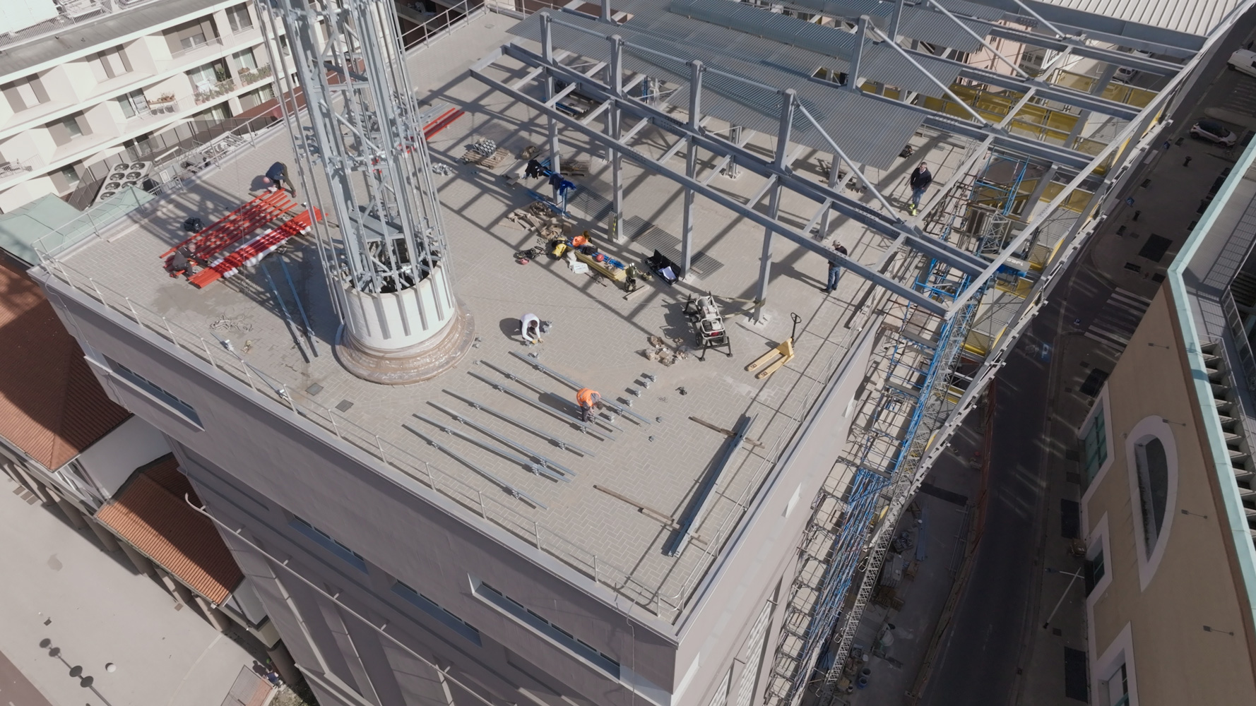 Ritenuto adeguato il basamento esistente della ciminiera, su esso (all’interno della porzione sopravvissuta) è stata appoggiata la nuova struttura (tralicciata a sezione quadrata sufficientemente piccola da poter attraversare la ‘bocca’ superiore della porzione sopravvissuta) per farla poi emergere fino al raggiungimento della quota massima.