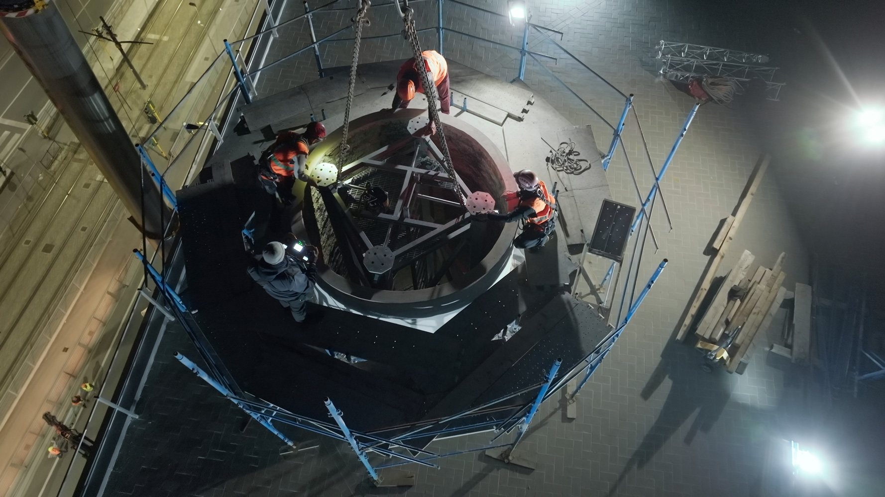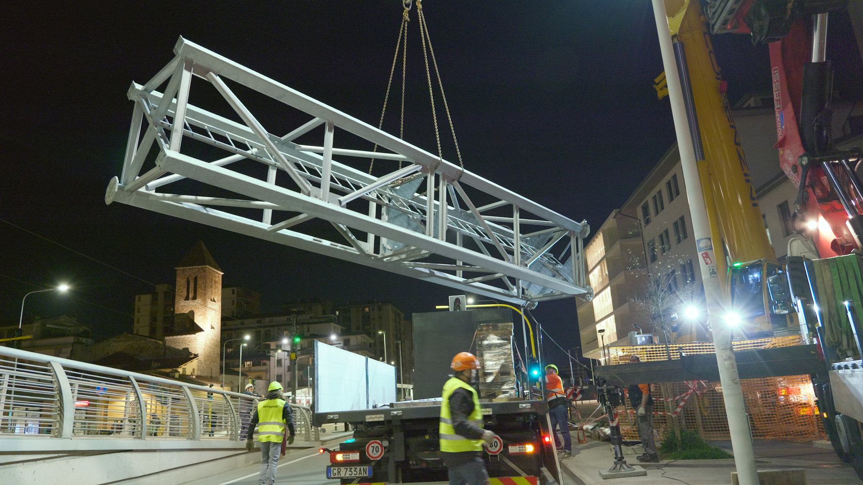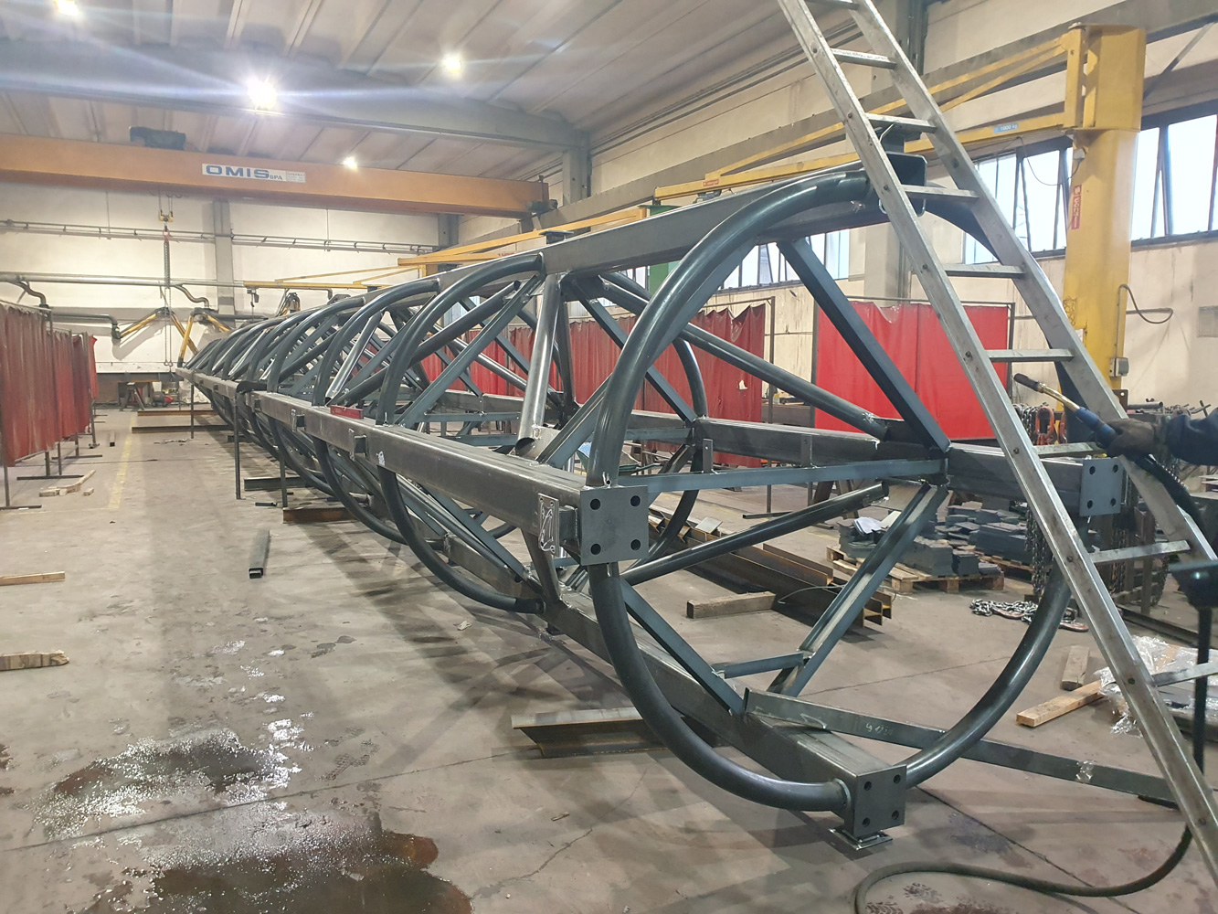 Ritenuto adeguato il basamento esistente della ciminiera, su esso (all’interno della porzione sopravvissuta) è stata appoggiata la nuova struttura (tralicciata a sezione quadrata sufficientemente piccola da poter attraversare la ‘bocca’ superiore della porzione sopravvissuta) per farla poi emergere fino al raggiungimento della quota massima.